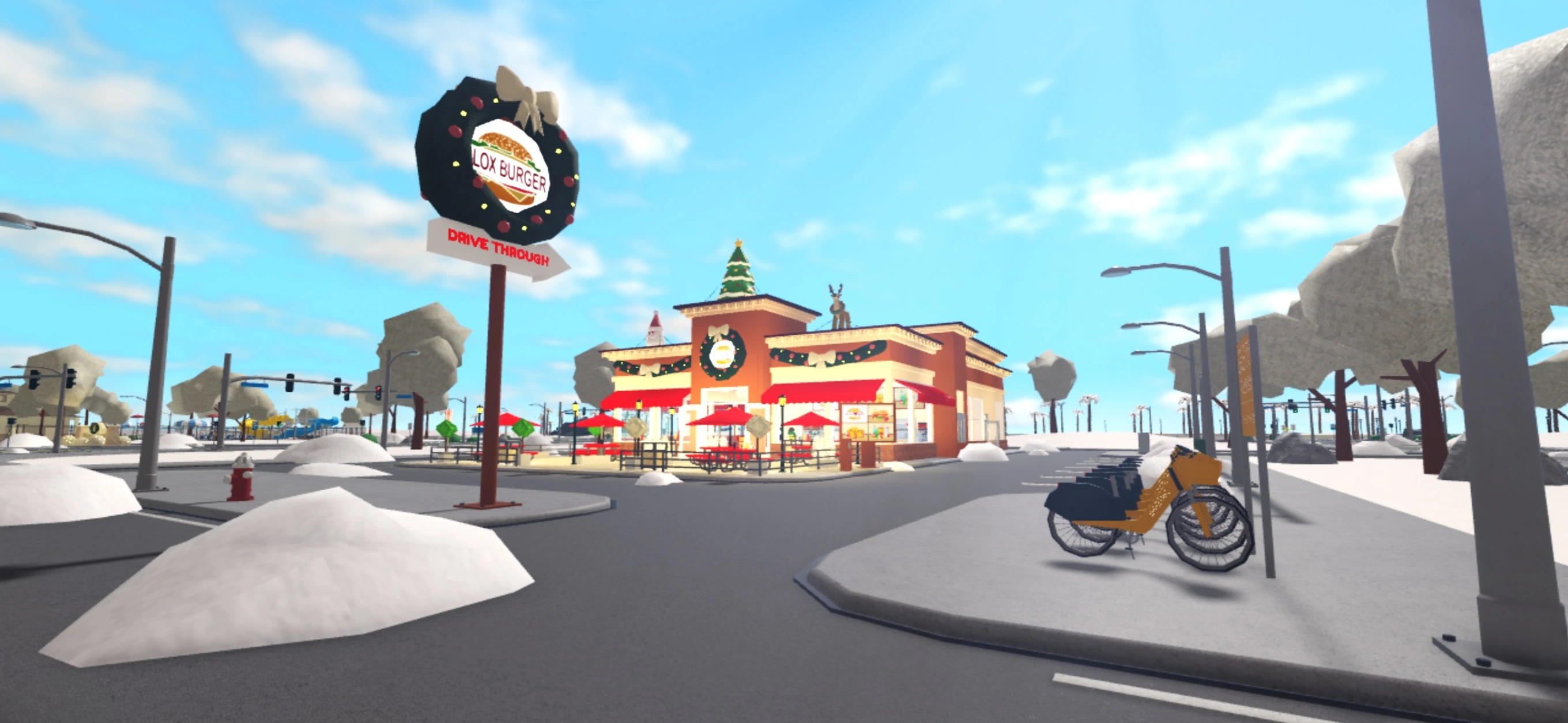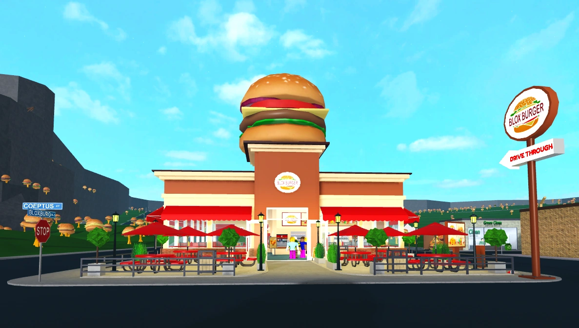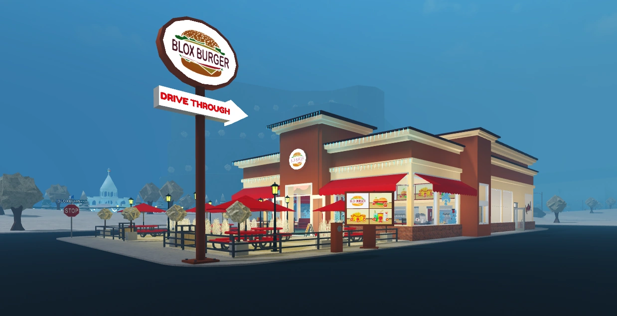 Blox Burgers is a fast food restaurant in the city of Bloxburg. Players can work here as a Fast Food Worker. Doing this job, players can be a Cashier and sell a variety of food, including burgers, fries, mozzarella sticks, onion rings, soda, and more to the NPC customers. Players can also be a cook and prepare the food for NPC customers, or players can restock the restaurant using the boxes in the freezer in the back of the restaurant.