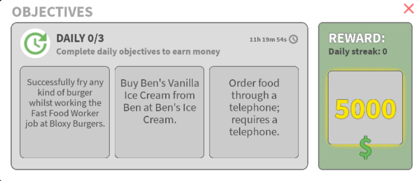 The Daily Objectives menu is a feature in Bloxburg that was added in Version 0.13.2. Players can use it to complete tasks and earn a reward.